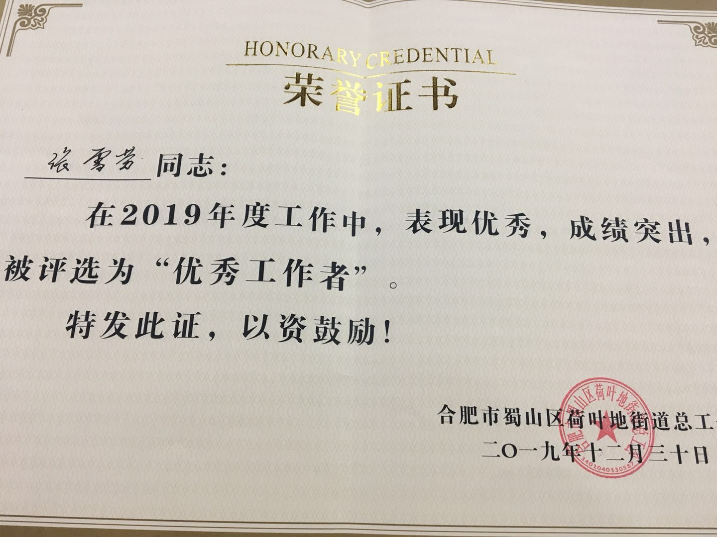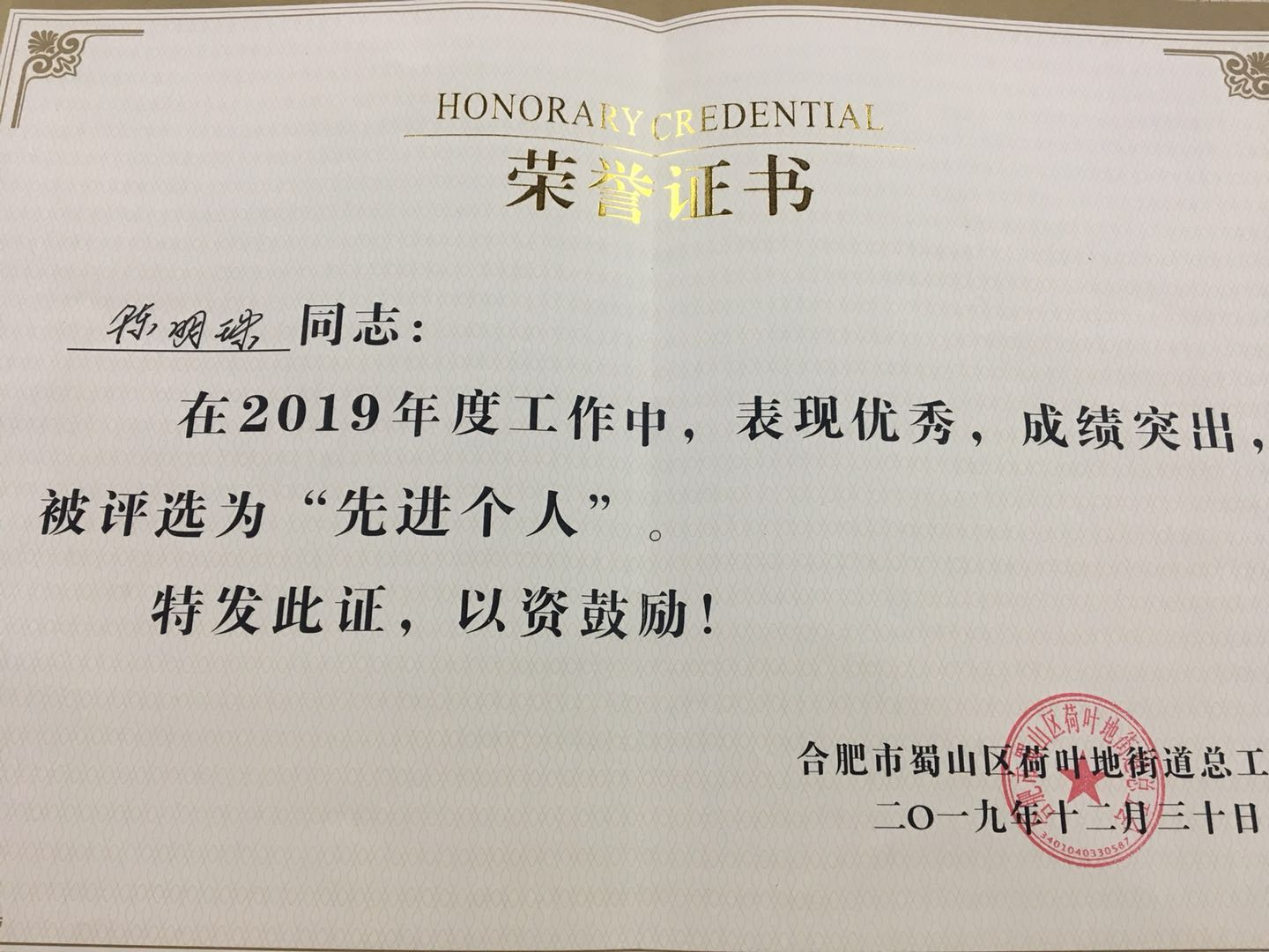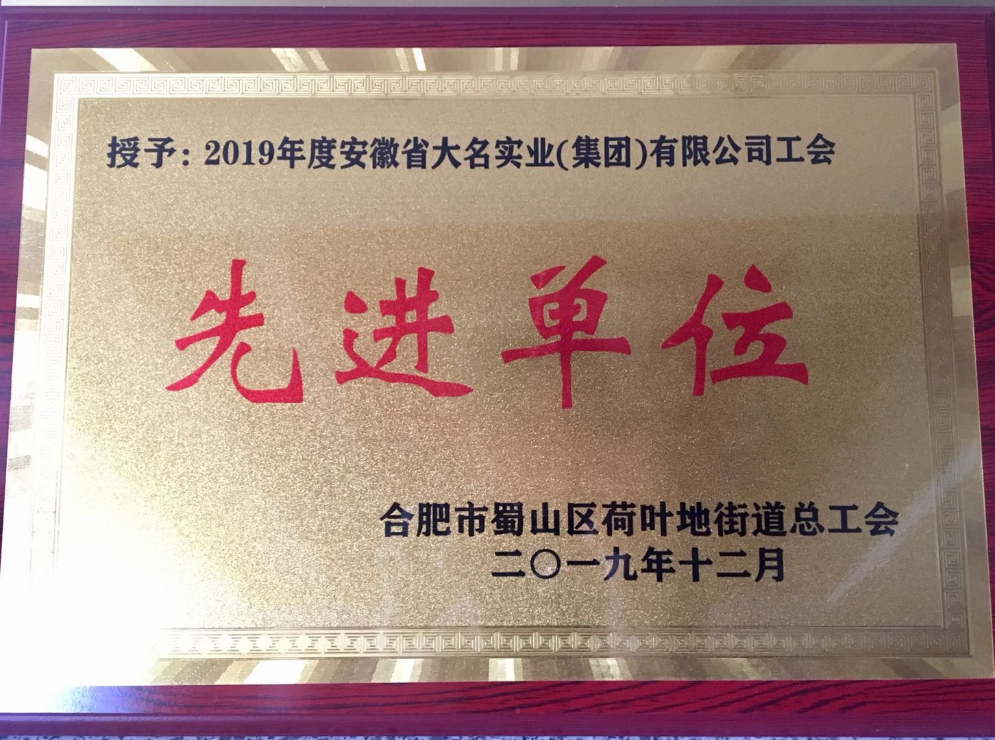 大名實業(yè)集團榮獲2019年度合肥蜀山區(qū)荷葉地街道總工會先進單位