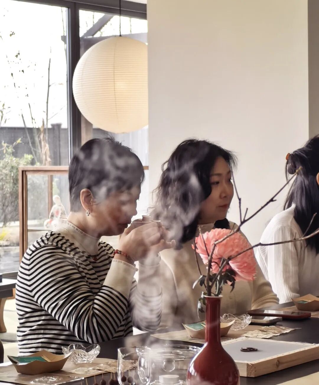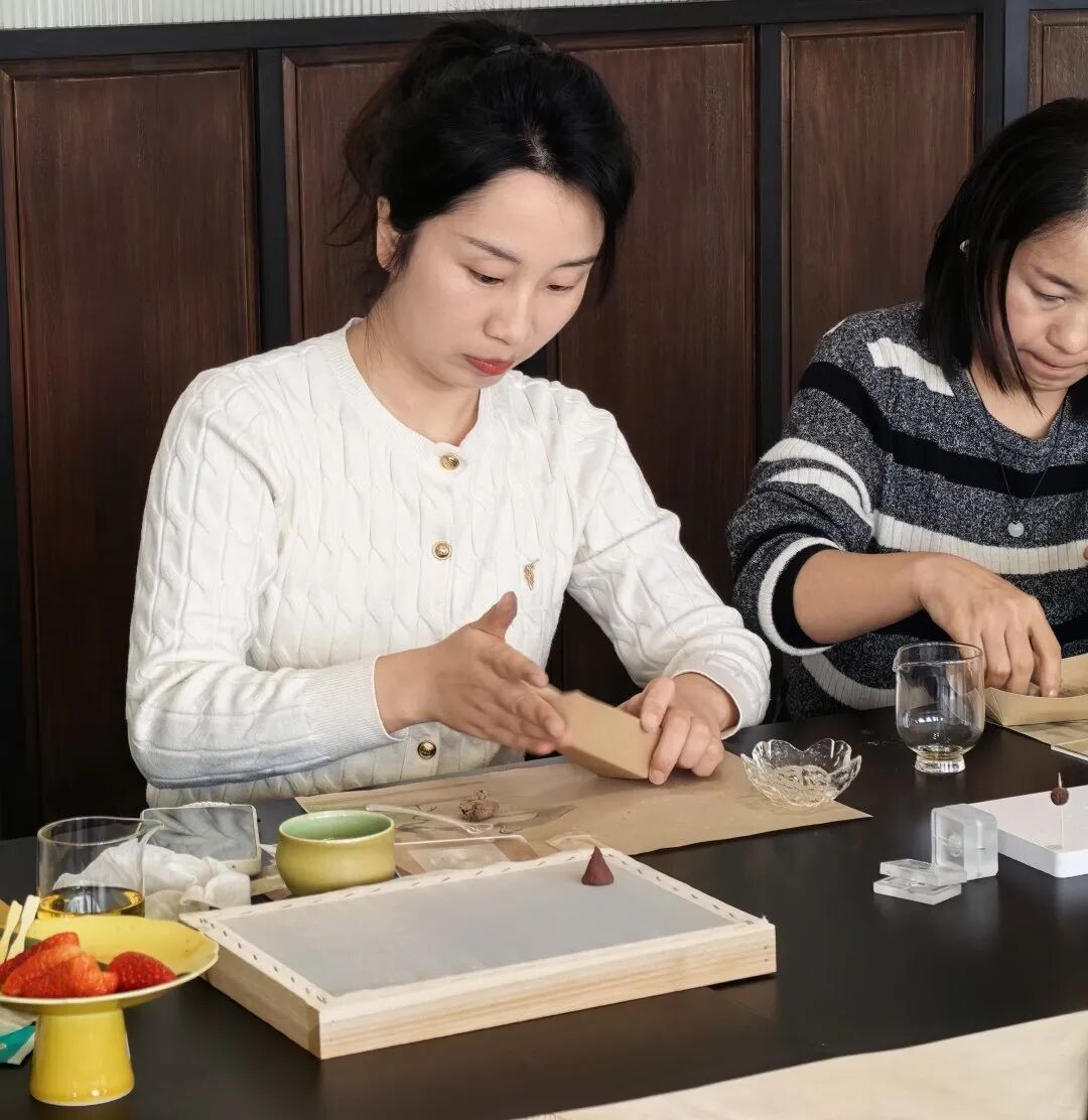 一盞清茶慰歲月,一爐篆香安時(shí)光。在品味了茶香之后,活動(dòng)進(jìn)入了更具東方意趣的香事環(huán)節(jié)。香事老師首先為大家開啟了一段“尋香之旅”,講解了香事文化背后蘊(yùn)含的東方美學(xué),以及當(dāng)季疏肝解郁香方拼配、日常生活中香方的搭配與使用。隨后進(jìn)入實(shí)操環(huán)節(jié),老師演示了“合香、和泥、醒泥再到定量分劑、壓模塑形,最后穿孔脫?!币幌盗屑妓?。