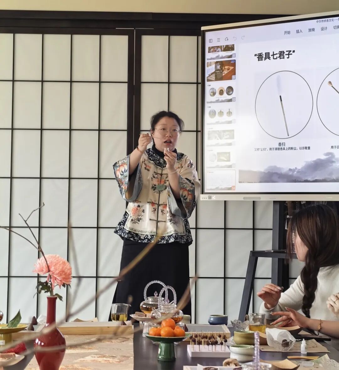 一盞清茶慰歲月,一爐篆香安時(shí)光。在品味了茶香之后,活動(dòng)進(jìn)入了更具東方意趣的香事環(huán)節(jié)。香事老師首先為大家開啟了一段“尋香之旅”,講解了香事文化背后蘊(yùn)含的東方美學(xué),以及當(dāng)季疏肝解郁香方拼配、日常生活中香方的搭配與使用。隨后進(jìn)入實(shí)操環(huán)節(jié),老師演示了“合香、和泥、醒泥再到定量分劑、壓模塑形,最后穿孔脫模”一系列技藝。